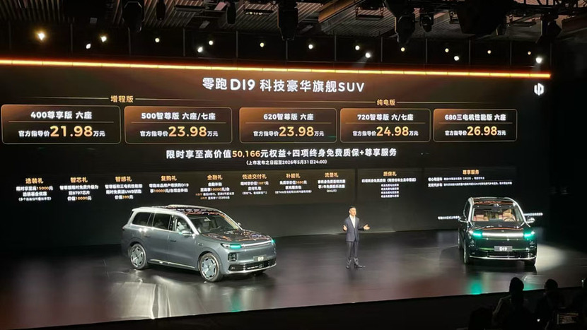 2026年4月16日,零跑汽车官方宣布——D19车型正式上市,共推出5款车型,售价区间为21.98-26.98万元。新车作为D平台首款车型,定位为全尺寸旗舰SUV,搭载高通骁龙双8797芯片,提供纯电及增程两种动力供选择。